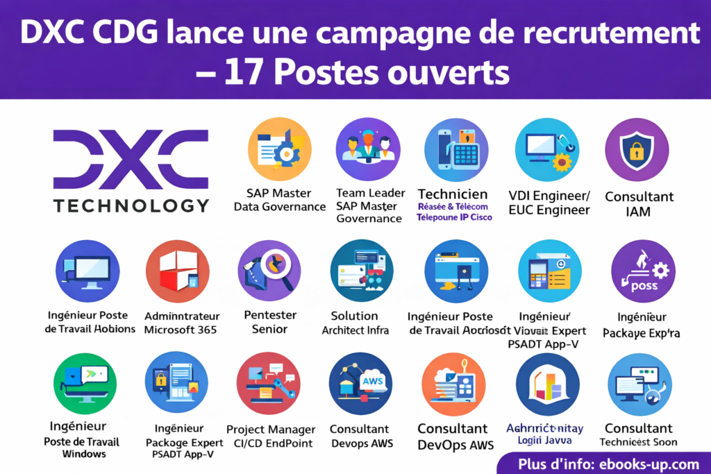 DXC CDG recrute plusieurs postes IT à Casablanca et Rabat, en CDI, avec un mode de travail hybride ou sur site selon les fonctions. Les postes s’adressent à des profils confirmés et seniors souhaitant intervenir sur des environnements d’entreprise, des plateformes de collaboration, des projets cloud, data et cybersécurité.